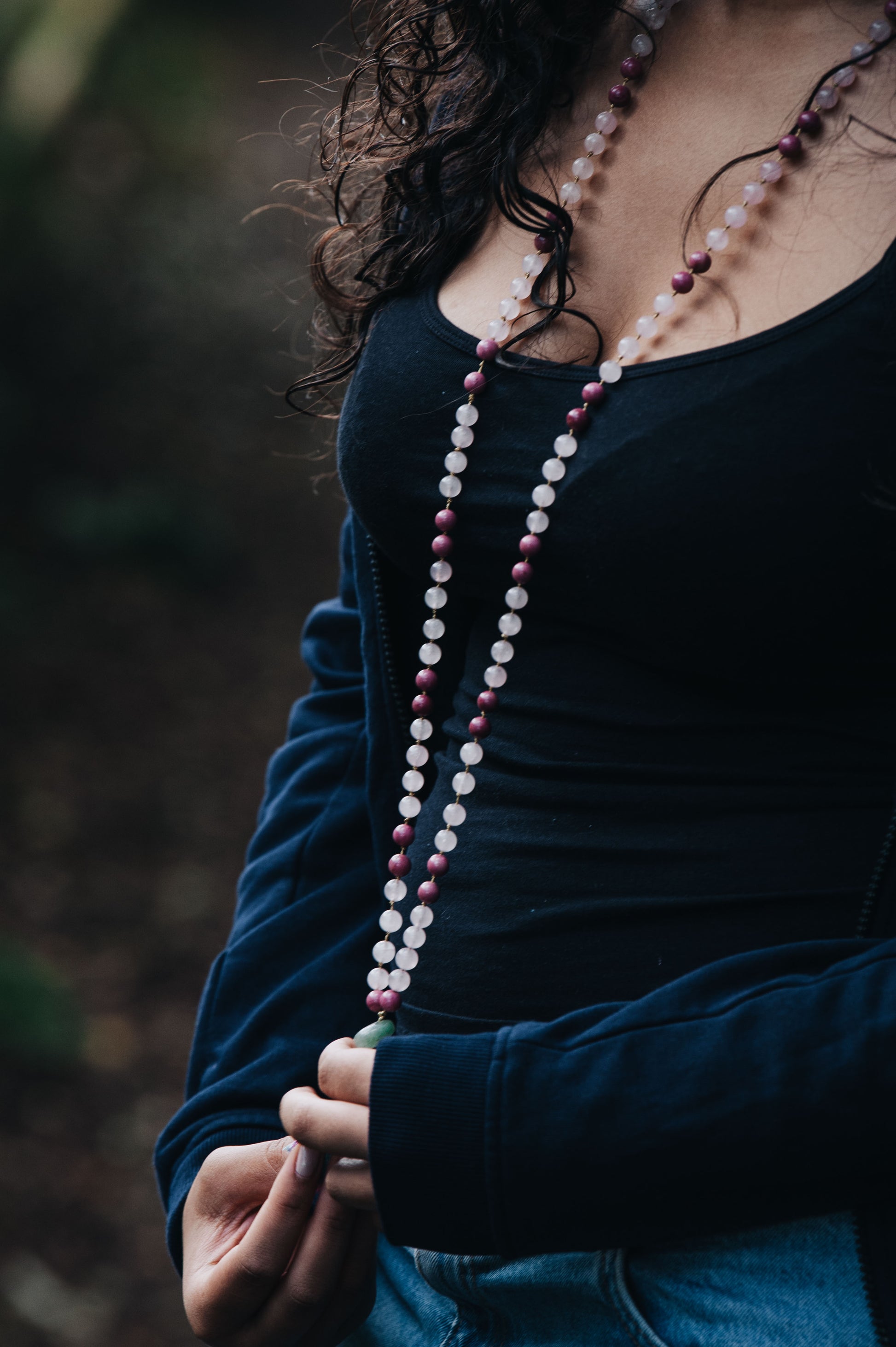 Your mala is hand-knotted bead by bead using our signature silver soul cord, a soft, luminous, biodegradable Tencel and bamboo blend chosen for durability, grounding, and symbolic resonance with the silver thread of spirit. It holds the beads with strength while remaining soft and soothing in the hands. It is designed to be touched, held, breathed with, and lived alongside.