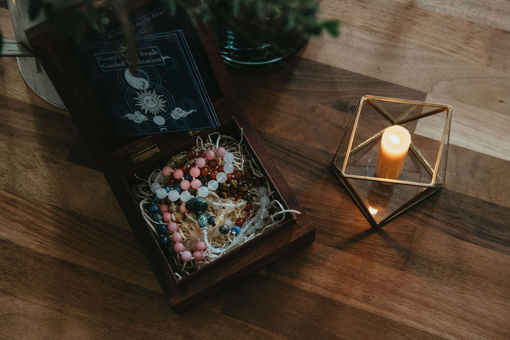 Once the mala is completed, I write a personalised guided meditation that speaks directly to the energy of the crystal combination that has come through. This meditation guides the wearer into presence, breath, and inner quiet, using the mala as a companion for grounding and return. It will be sent in a written format that can be returned to again and again.