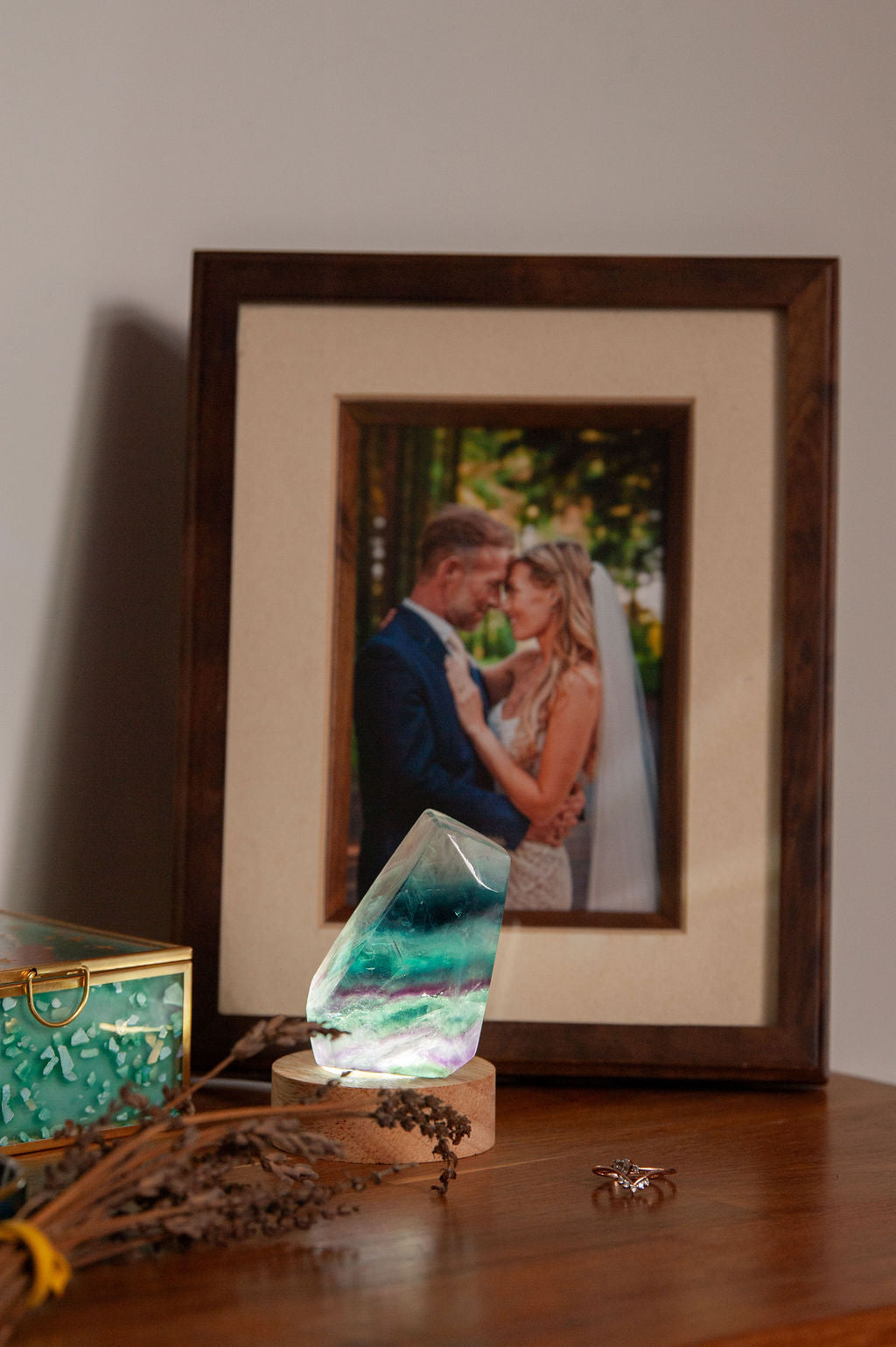 Fluorite has a way of gently collecting the day and letting it rest. Some people like to place their smaller crystals or jewellery beside it, allowing everything to clear and recharge quietly. Because each lamp is carved from natural crystal, the colours, bands and patterns will vary. These differences are part of its life and character, making each lamp a quietly unique companion.